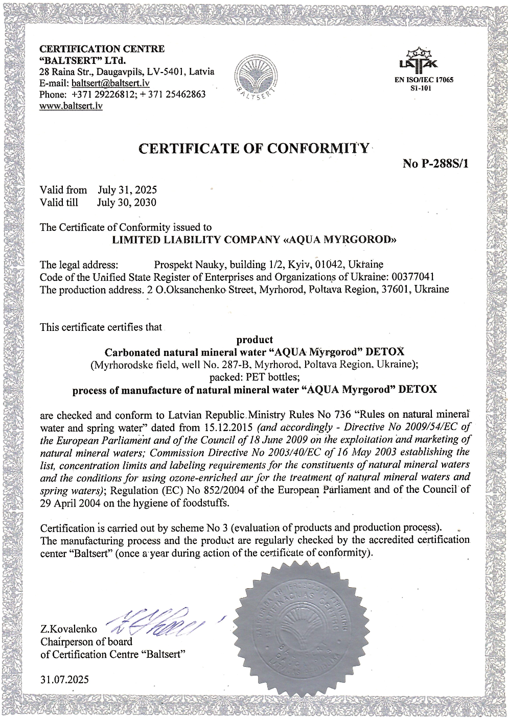 Apa minerală naturală „AQUA Mirgorod” Detox conține raportul optim de calciu, potasiu, magneziu, necesar în condițiile însoțite de deshidratare și intoxicație a organismului datorită activității fizice semnificative, căldură, intoxicație cu alcool, intoxicație, diaree, infecții intestinale acute.